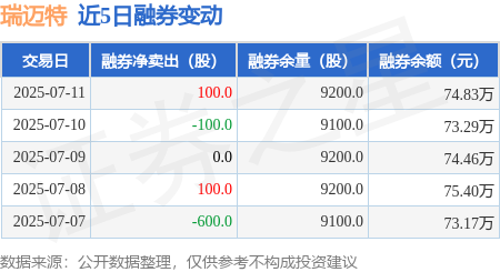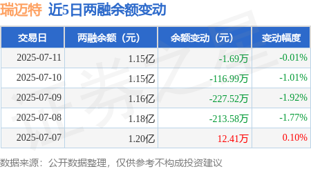瑞迈特:7月11日融券卖出100股,融资融券余额1.15亿元